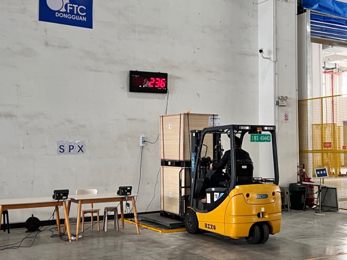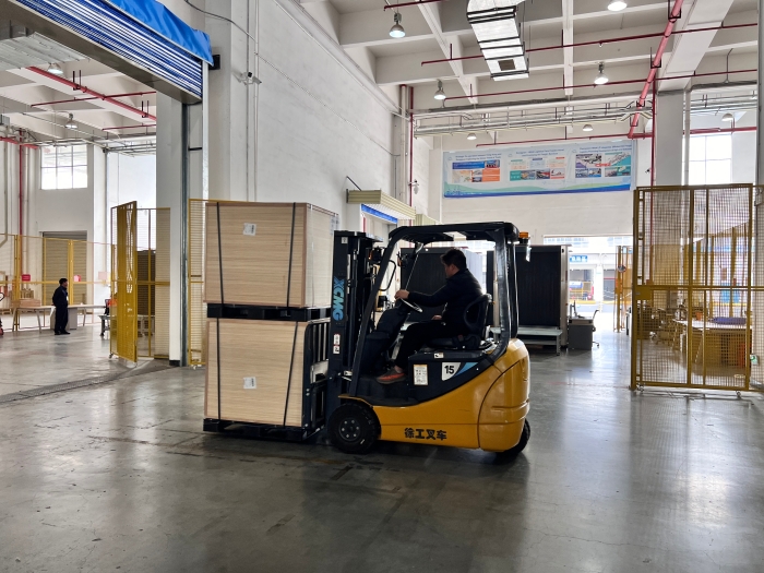 在華南區(qū)某大型保稅倉內(nèi),十幾臺(tái)徐工三支點(diǎn)系列叉車正在進(jìn)行緊張的搬運(yùn)工作,