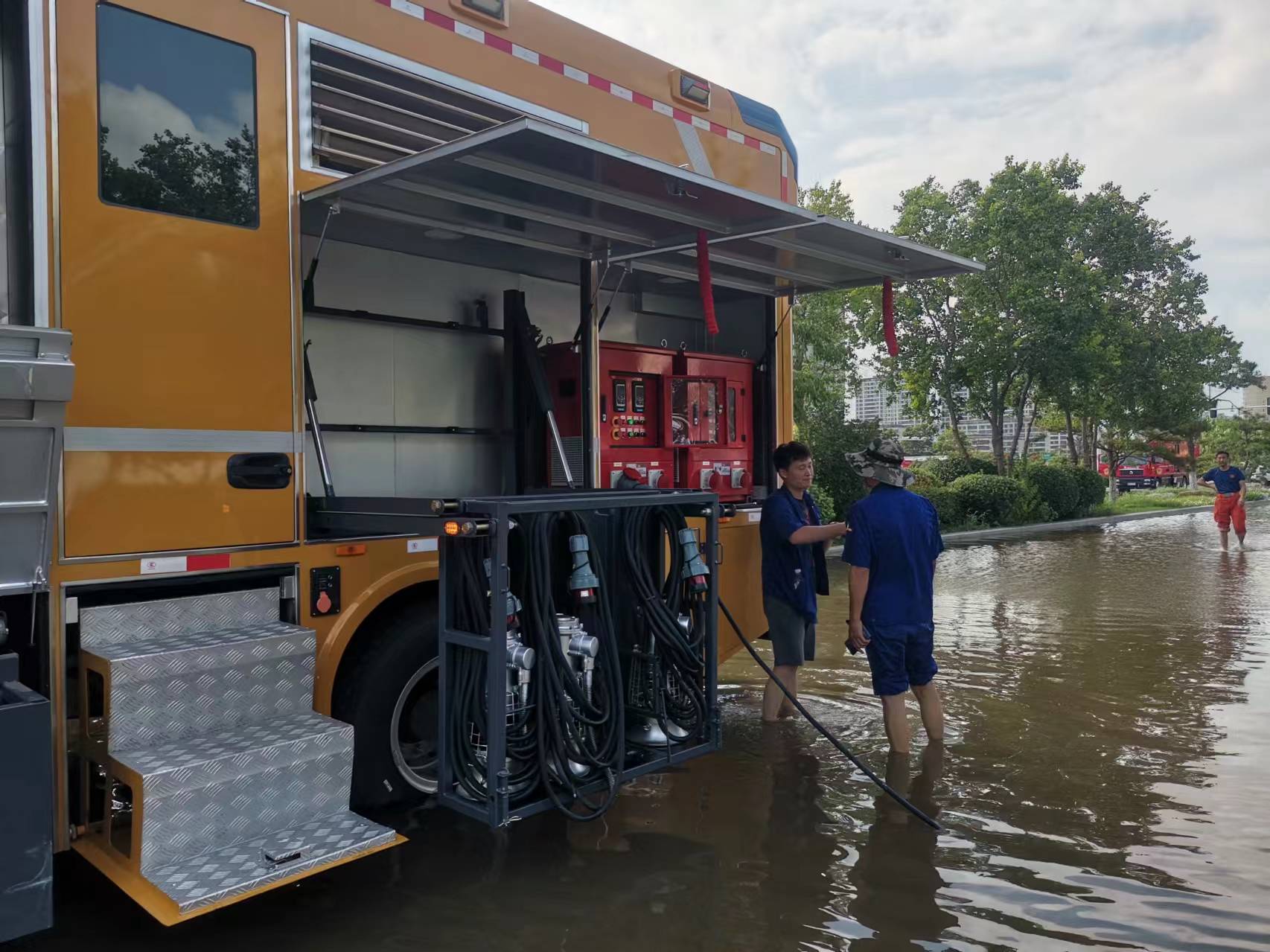 7月中旬,河南省普降大到暴雨,降雨時間長、強度大、影響廣,多市發布暴雨Ⅰ級預警,人民生命財產安全面臨巨大威脅。接到有關單位緊急通知后,徐工迅速集結車輛人員,出動PS40B泵組式排水搶險車,攜帶足量隨車器材,連夜動身前往河南商丘,火速開展救援。