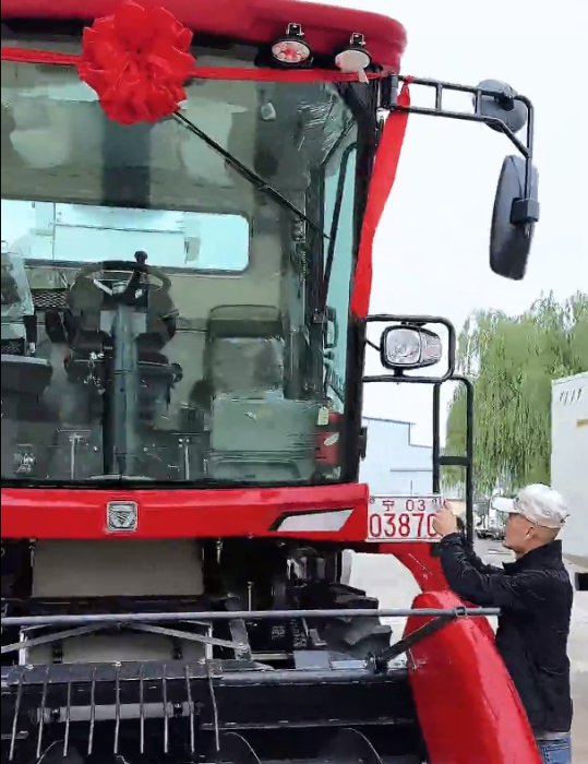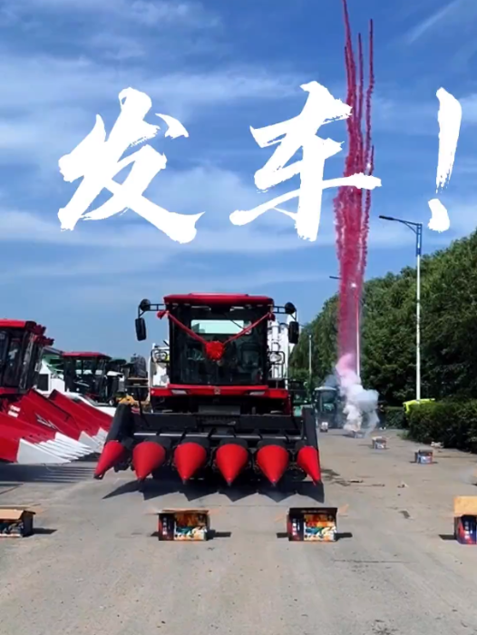 提車現場,禮花鞭炮齊鳴,身披大紅花的玉米收獲機整齊排列,一臺接一臺奔赴田間地頭,即將逐夢沃野,繪就豐收圖景。