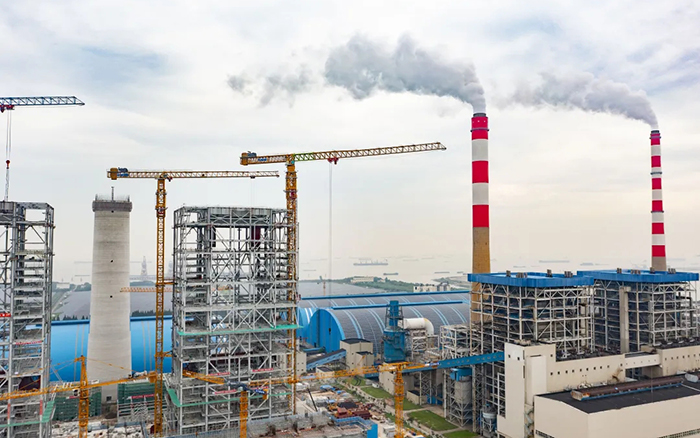 側(cè)望長江畔,機器轟鳴、江水潺潺,華能太倉電廠機組擴建項目施工現(xiàn)場一派繁忙景象,XGT3100-160S、XGT1350-64S兩臺徐工超大塔穩(wěn)穩(wěn)矗立在高聳的鋼架間吊裝作業(yè)。