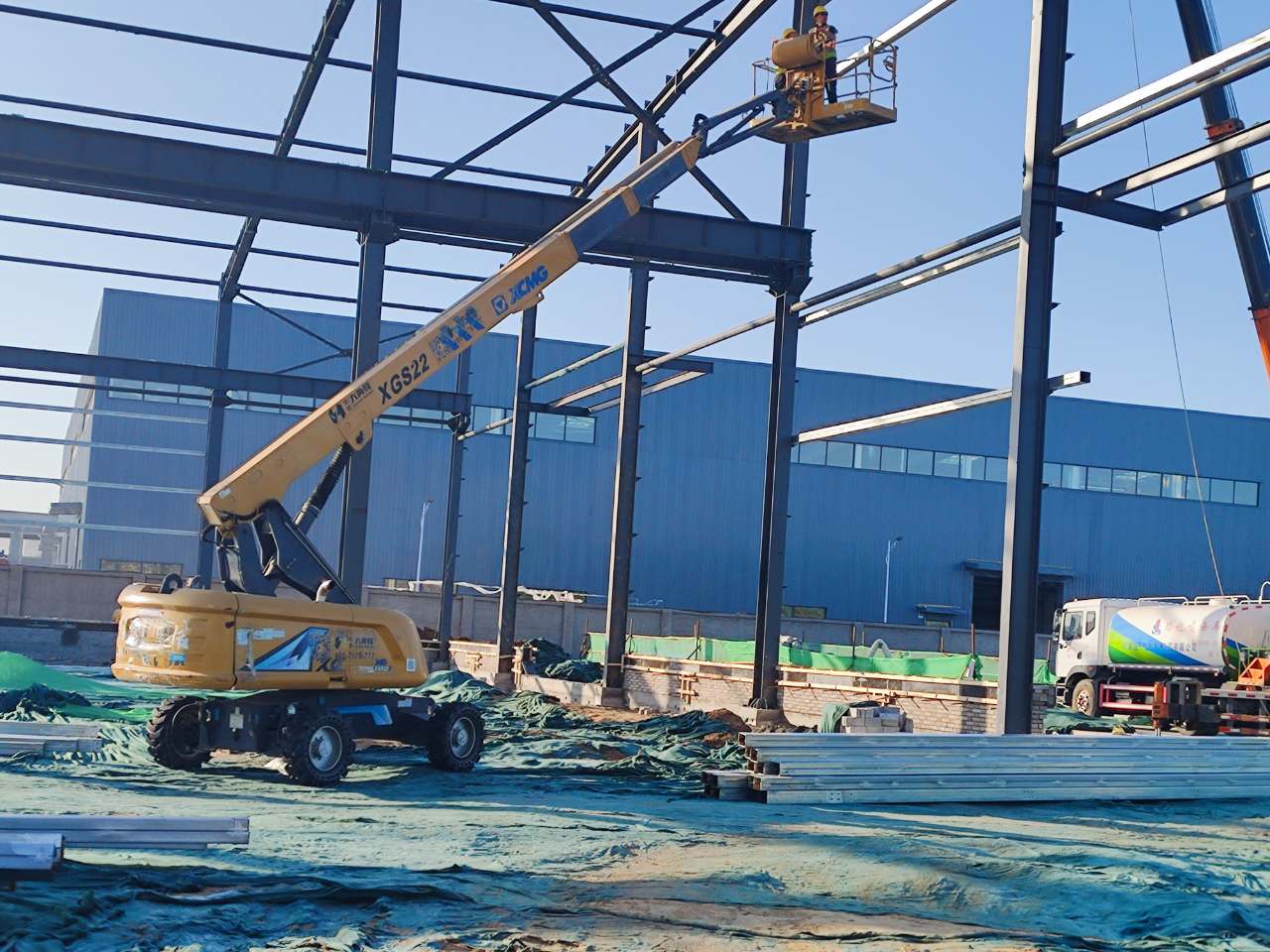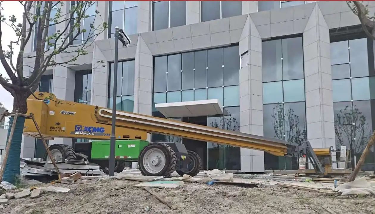 目前,徐工XGS22ACK-Li、XGS22K、XG1412HA等二十余臺設備正在此聯合作戰,開展外立面鋼結構安裝、外立面玻璃安裝以及室內管道安裝等相關工作,為這所占地31萬平方米的綠色校園添磚加瓦。