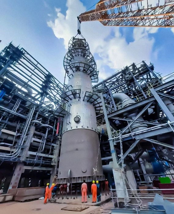吊裝過程中,徐工XLC30000履帶起重機采用108m超起主臂單雙臂增強工況,將重達650t的項目首臺氫化反應器緩緩起吊豎立,并提升至40m高處,隨后完成吊載回轉,精準落置在指定安裝位置。