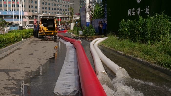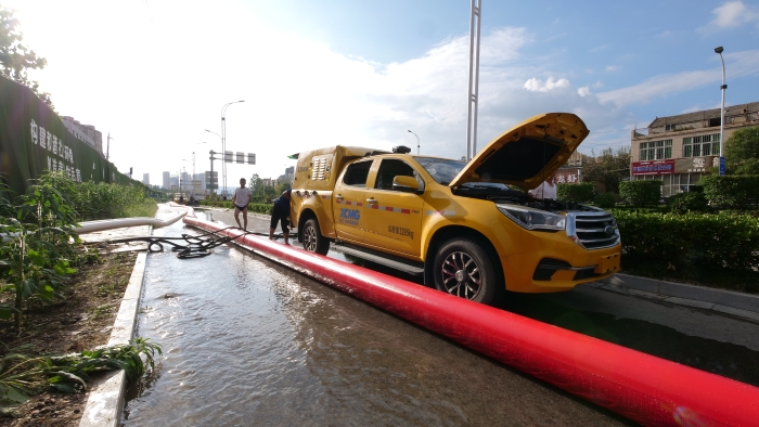 調(diào)試車輛、鋪設(shè)水帶、檢查管路,現(xiàn)場排水作業(yè)緊鑼密鼓地進(jìn)行著。XGH5030TPSQ6爭分奪秒與時間賽跑,每臺車流量超600m3/h,最大可達(dá)1000m3/h,將積水源源不斷地排入下水道中。