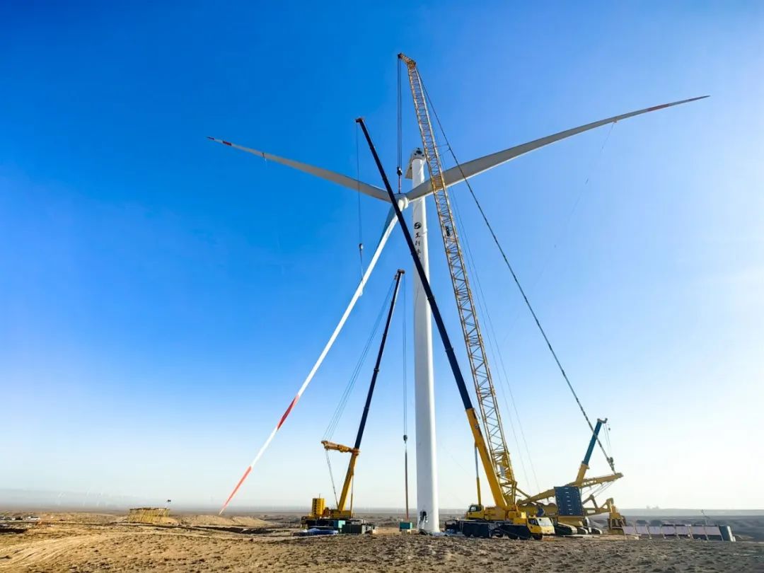 隨著施工號角吹響,各臺起重機緊密配合,XLC18000M采用138+8m的標準風電工況,穩穩將98m長的葉片與112t重的輪轂、葉片在百米高空精確連接到機艙,XGTC160-I、XCA600L8 和 XCA200L8_2則靈活調整位置,輔助完成關鍵部件的吊裝,整個吊裝過程精確無誤。