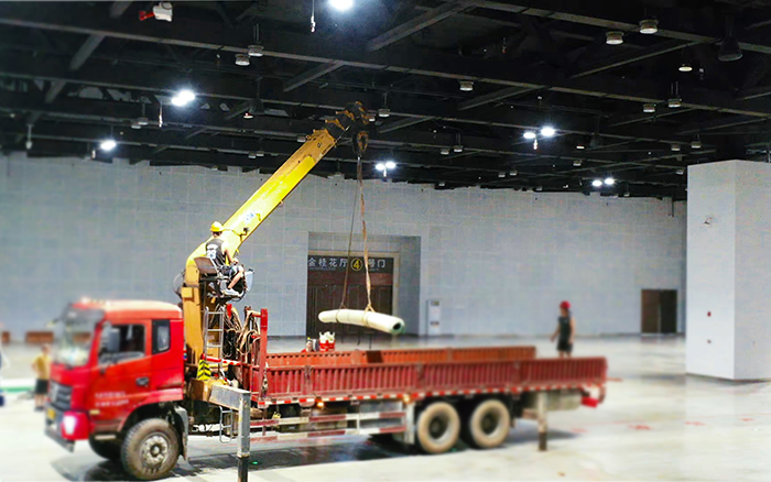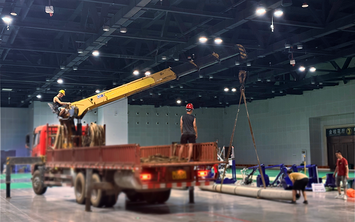 在廣西國際會展中心體育場館塑膠鋪設施工現(xiàn)場,徐工隨車起重機以硬核實力成為工程推進的 “主力軍”,贏得客戶連連稱贊。