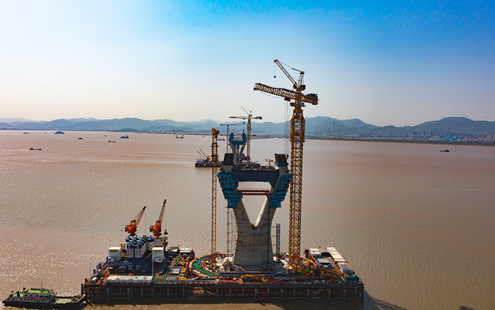 初夏時節(jié),東海之畔,徐工XGT7300-260S、XGT8300-320S揮舞鐵臂,如“定海神針”矗立深藍(lán),助力舟山六橫大橋二期工程青龍門大橋主塔施工,“海上巨龍”穩(wěn)扎穩(wěn)打向上攀升。
