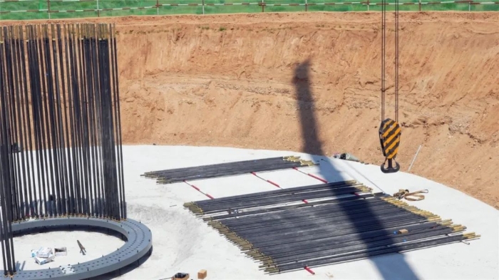 此次進行的是風電基礎吊裝,重達17噸的鉚盤穩落在基坑,214根鉚桿密集插裝,每一根都必須精準插入孔位。