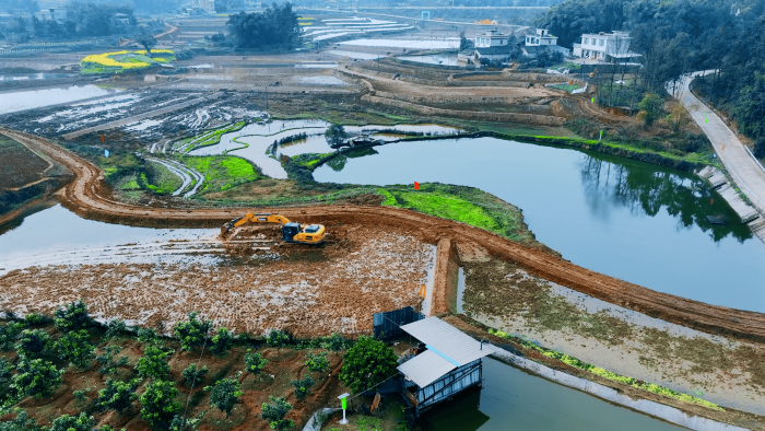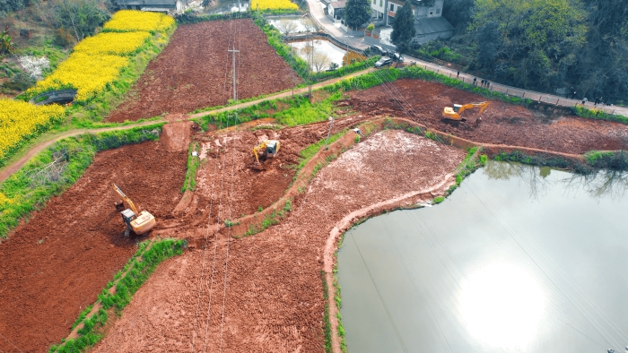 繼續向東,這里是萬里長江第一城——宜賓,在宜賓江安縣陽春鎮,5000畝高標準農田建設進入尾聲,項目高峰期投入30余臺徐工挖掘機。