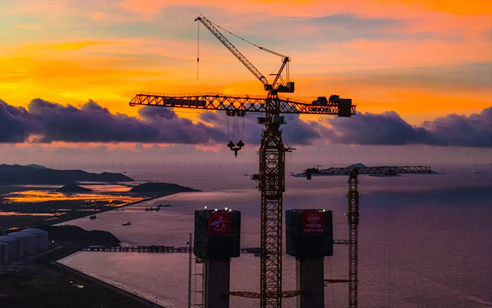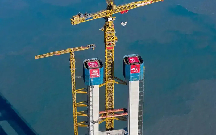 在封頂作業中,徐工塔機將百噸構件以毫米級精度吊裝至200余米高空,硬剛10級海風,創造了海上橋梁建設新紀錄。多臺群塔協同作業,創造性攻克"高空精度、抗風穩性、吊裝效率"三大世界級施工難題,展現了中國裝備的卓越性能。