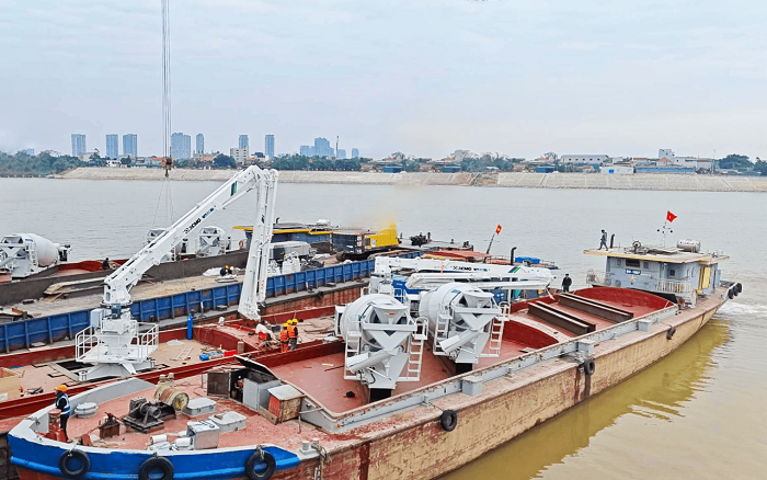 近日,專為水上施工定制的兩臺徐工船載式布料機與八臺船載式攪拌罐裝車順利集結,正式發往越南,將投入到當地重點跨河大橋項目建設中。