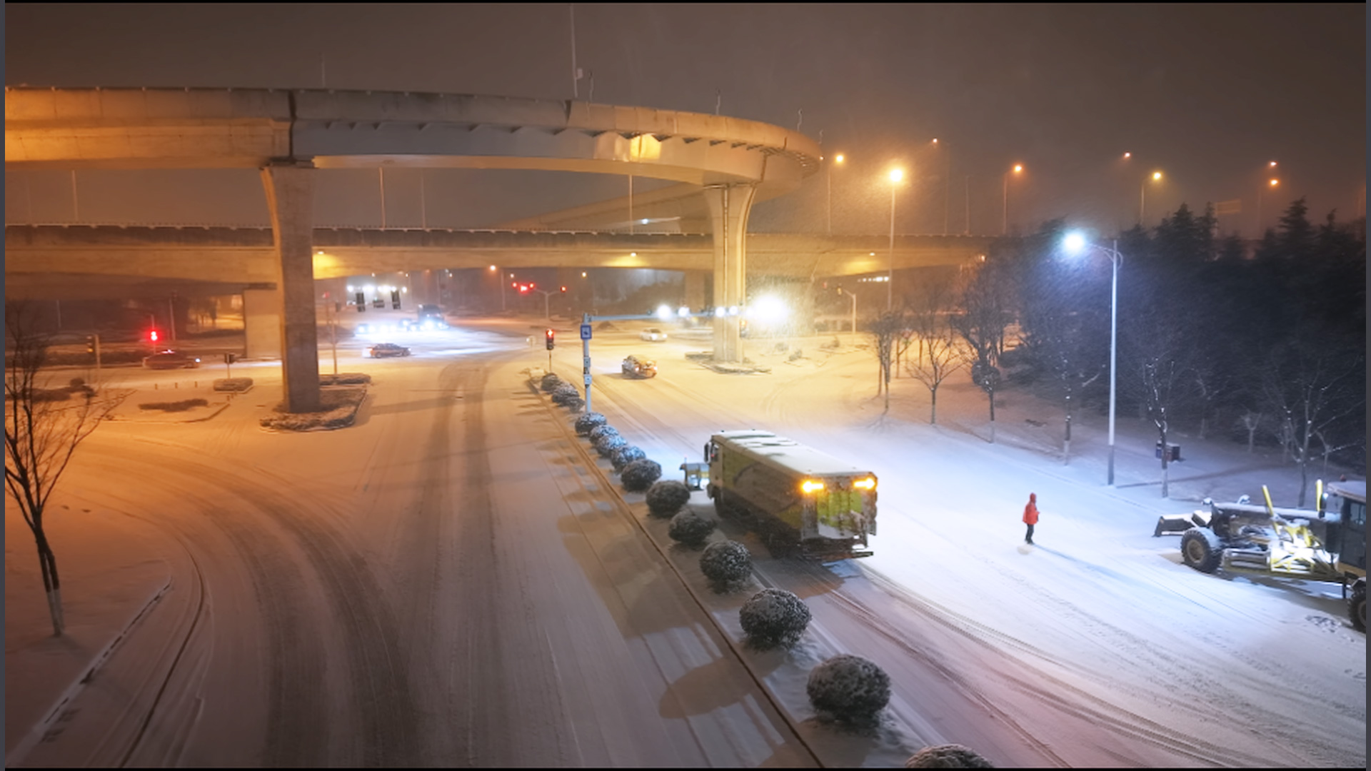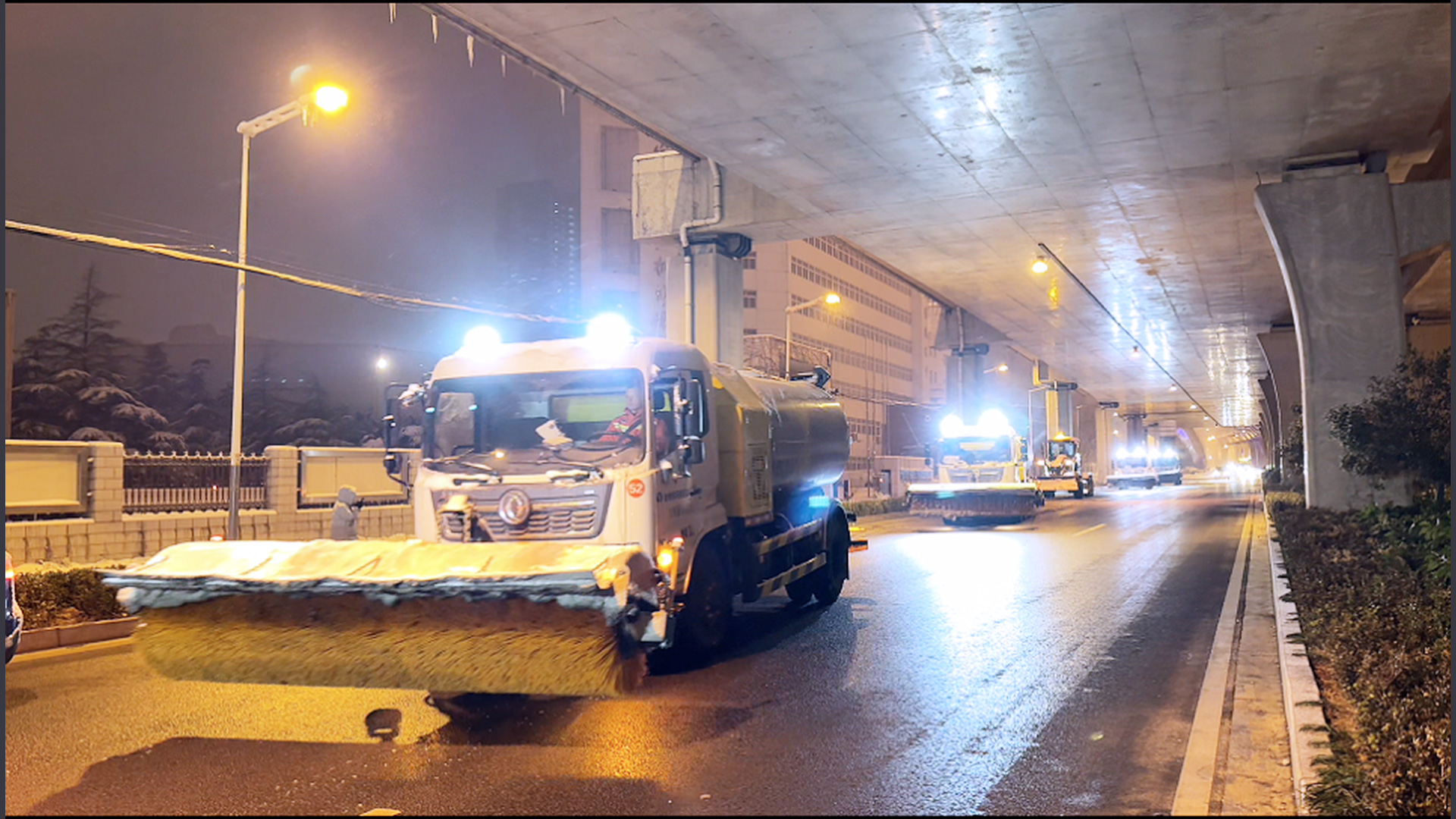 1月20日0點,徐工除雪設備和救援隊在徐州東三環快速路集結,對整條三環高架道路除雪,保障清晨的正常通行。