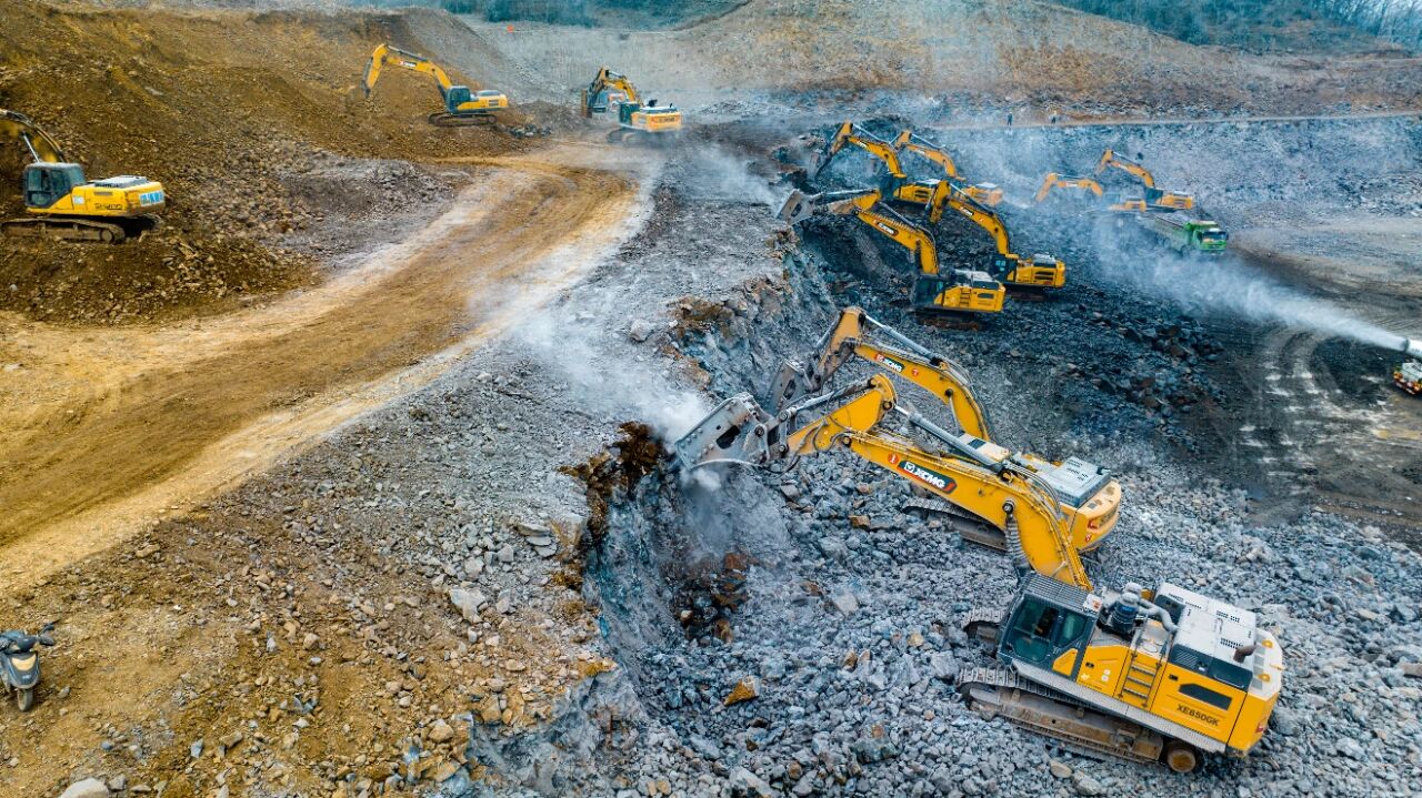 為確保工程順利推進、搶抓冬季施工黃金期,施工方經過多次研討優化施工方案,最終選定徐工挖掘機承擔本次場平核心任務。目前,現場已陸續進駐14臺徐工挖掘機,全面包攬山體玄武巖破碎及土石料裝車等關鍵工序,全力攻堅約300萬方的工程總量。據悉,滁州部分施工區域地質條件復雜,多為堅硬玄武巖,對施工設備的效率與可靠性提出極高要求,而徐工XE650GK等明星機型憑借出色性能成為攻堅主力。其中8臺XE650GK搭配215破碎錘,依托獨有的破碎多級調頻控制技術,高效破解高硬度巖石施工難題,每日保底破碎玄武巖1500噸以上,輕料作業日產量可達2000至3000噸,且油耗控制在40L左右,實現高效與節能雙贏;徐工380、335等機型則協同開展土石方挖裝作業,搭配礦山專用鏟斗,以靈活操作、穩定底盤和優異的挖裝效率,成為施工現場的“得力干將”。