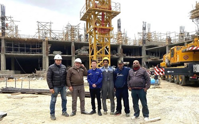 在這片晝夜溫差近二十度的荒漠之上,徐工塔機埃及服務團隊,耗時一個半月,連裝8臺徐工XGT7022-10S塔機,并一次性通過第三方檢測,順利完成本次裝機任務,再獲項目施工方高度贊譽!