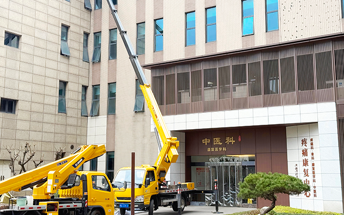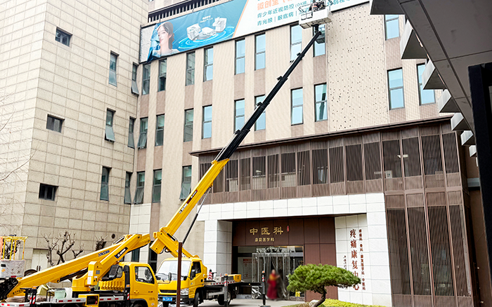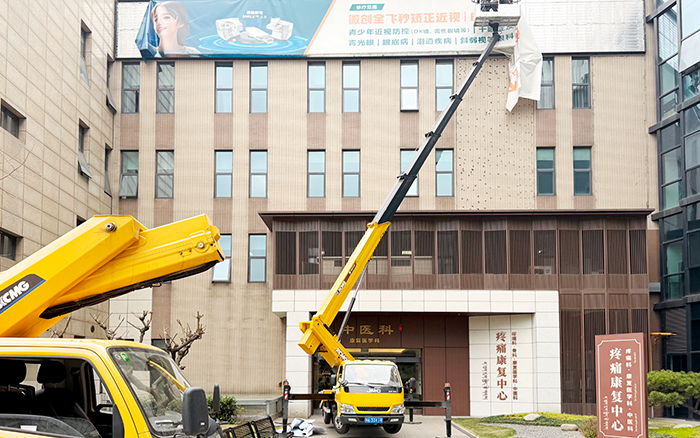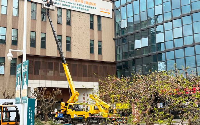 廣告牌坐落于醫(yī)院門診樓高層,作業(yè)高度超出常規(guī)設(shè)備作業(yè)范圍;建筑入口空間緊湊,周邊人流密集,既要避免干擾醫(yī)院正常診療秩序,又要保障設(shè)備靈活轉(zhuǎn)向與精準(zhǔn)定位;同時(shí),緊鄰門診區(qū)域的作業(yè)環(huán)境對(duì)施工安全與穩(wěn)定性提出了較高要求,需全程保持設(shè)備平穩(wěn)運(yùn)行。